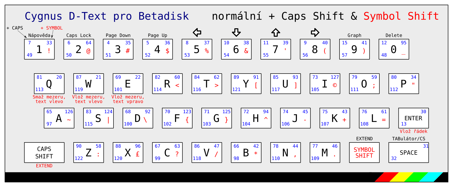 CS+SS - zapíná / vypíná EXTEND režim. Toto je jakási náhrada klávesy CTRL na ZX Spectrum dovolující schovat pod písmena speciální funkce. Každá z nich bude popsána v odpovídající "kapitole". EXTEND režim fungoval jak v původním Spectral Writeru, tak i D-Textu a v Desktopu. Kromě toho lze další funkce ukrýt pod klávesu kombinovanou se Symbol Shiftem stisknutou v EXTEND režimu, například EXT SS+K otevírá v Desktopu diskové menu a stejně bude fungovat i v D-Textu, kromě toho, že pro stejný účel ponechávám EXT SS+A, což je tak blízko, jak jen lze původnímu SS+A, což v mé verzi D-Textu píše vlnovku. Ta se ve Spectral Writeru psala EXT SS+A... Mě dává větší smysl psát znaky jednodušeji bez EXT režimu, EXT režim by měl vyvolávat komplexnější funkce než jen vložení znaku do textu. Zapnutý EXTEND režim je signalizován červeným okrajem obsazovky