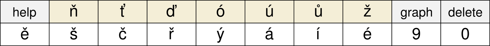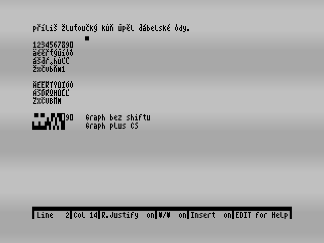 CS+9 - zapíná GRAPH režim pro psaní znaků s diakritikou, podrobněji viz dále, zapnutý GRAPH režim je signalizován žlutým okrajem obsazovky