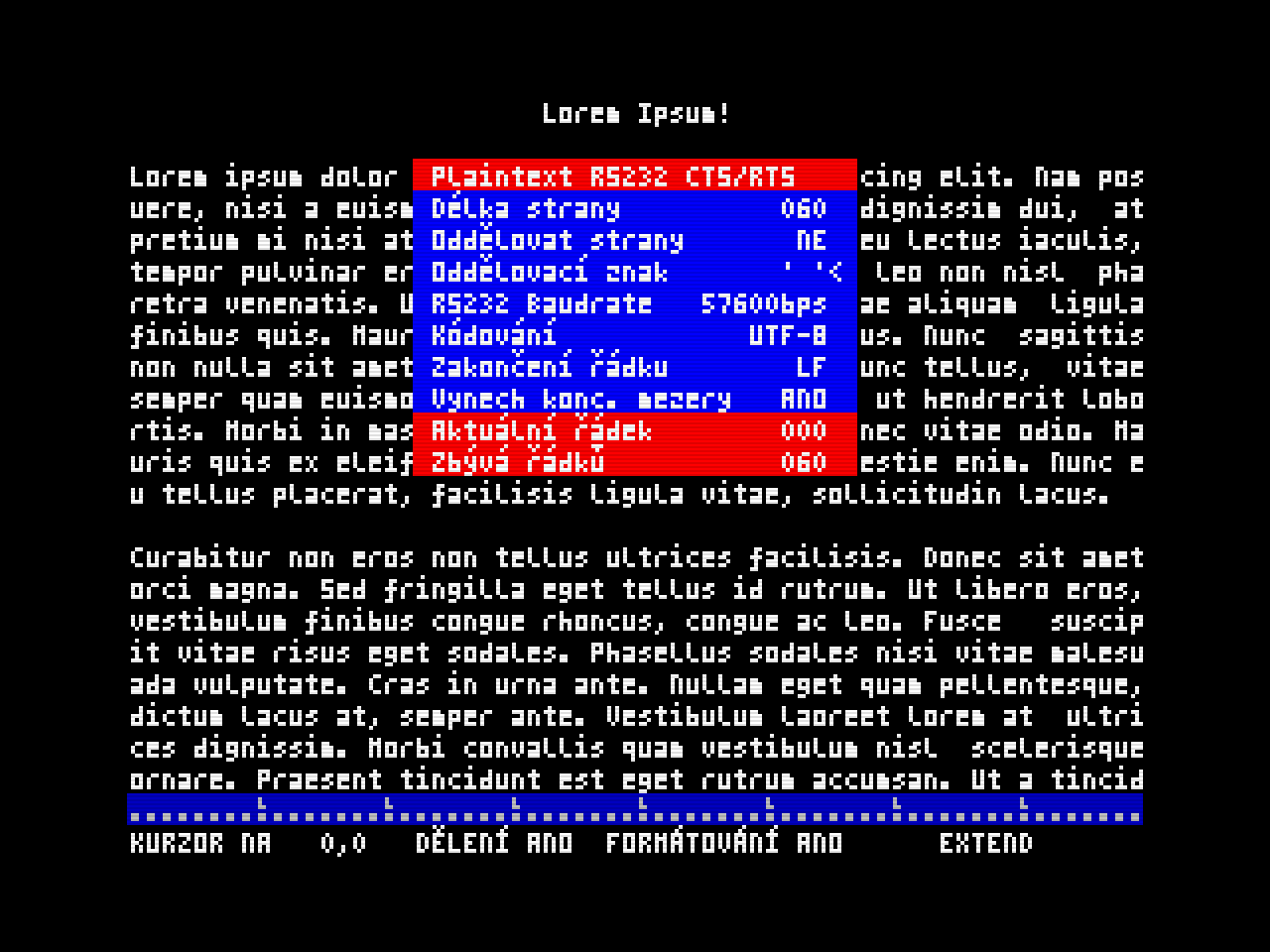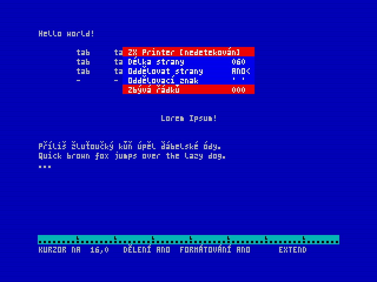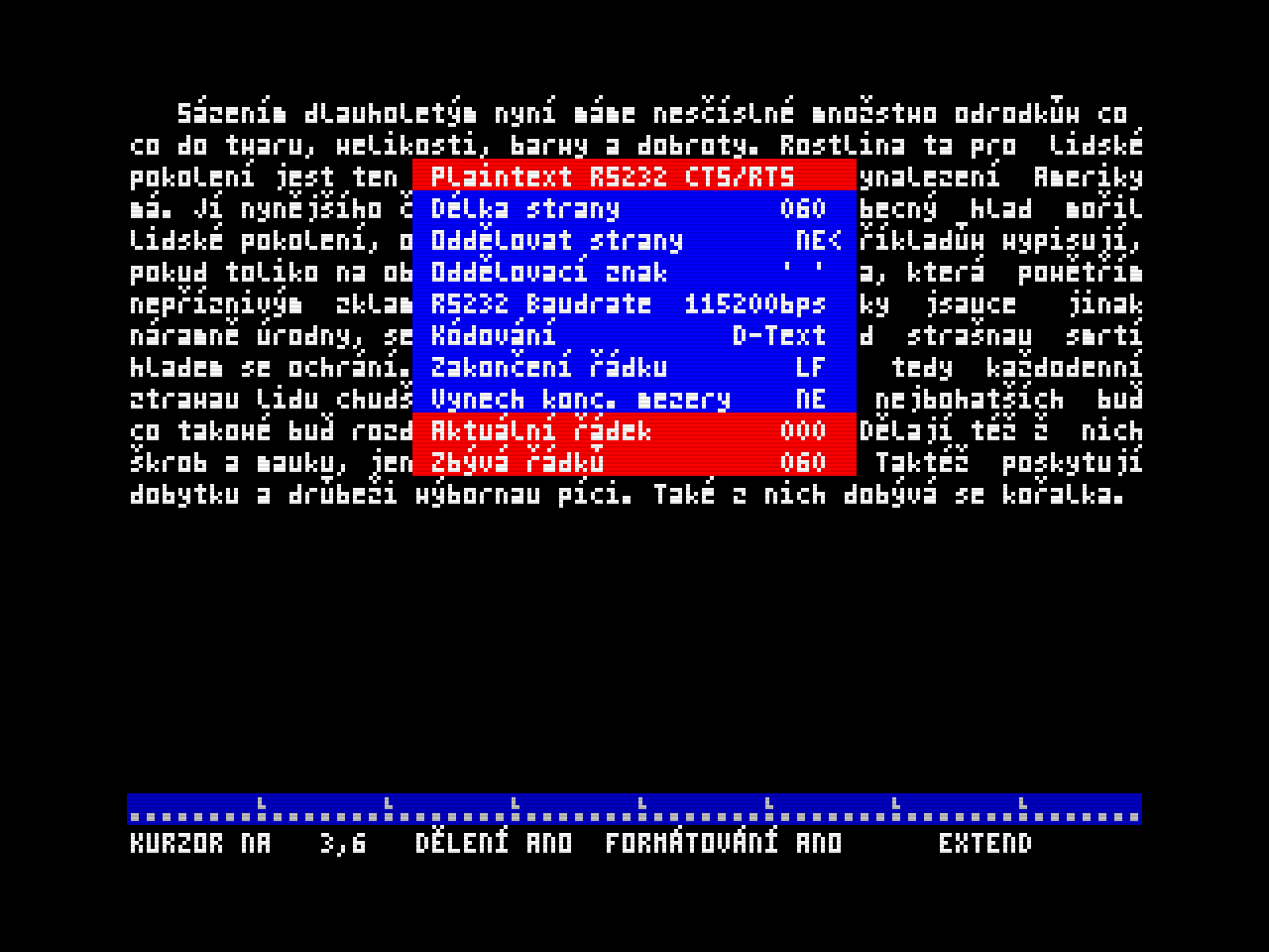 V původním D-Textu bylo hlavní menu místem i pro tisk a nastavení tiskárny. To přestalo dávat smysl, protože nastavení tiskárny je pro každou tiskárnu jiné a má být výhradně záležitostí ovladače. Hlavní menu proto bude dovolovat pouze načtení ovladače tiskárny, resp. obecně pluginu. Nastavení jsem přesunul pod klávesovou zkratku EXT I v editoru, po vzoru Proximáckého Desktopu, protože je obvykle potřeba před spuštěním tisku pomocí EXT P (opět po vzoru Desktopu).