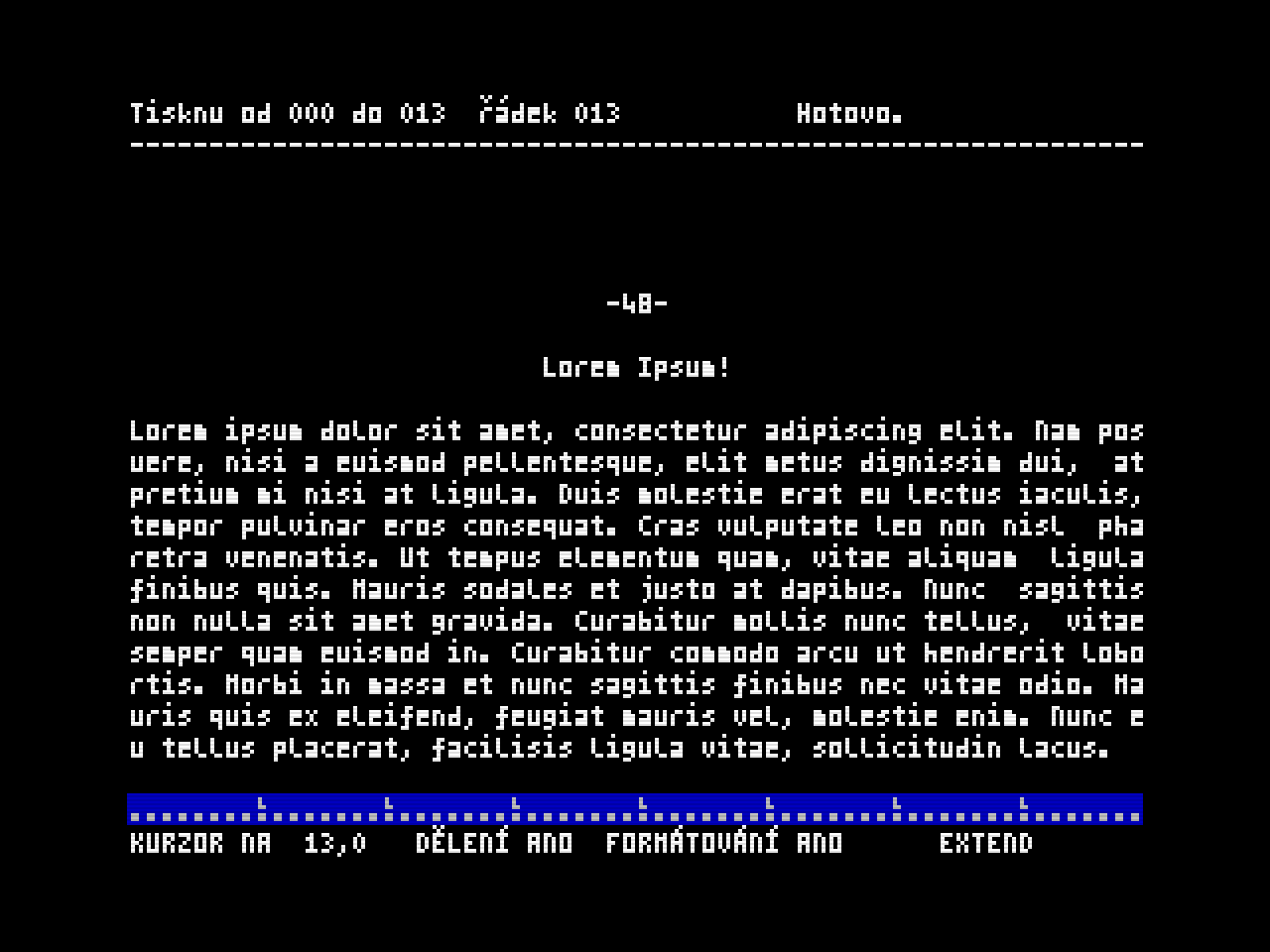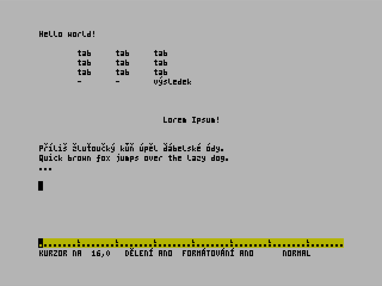 - stejně jako původní D-Text/Spectral Writer práce s neproporcionálním písmem a pevnou šířkou 64 znaků na řádek