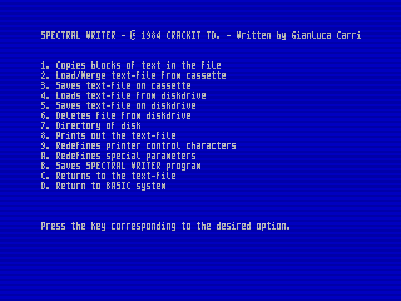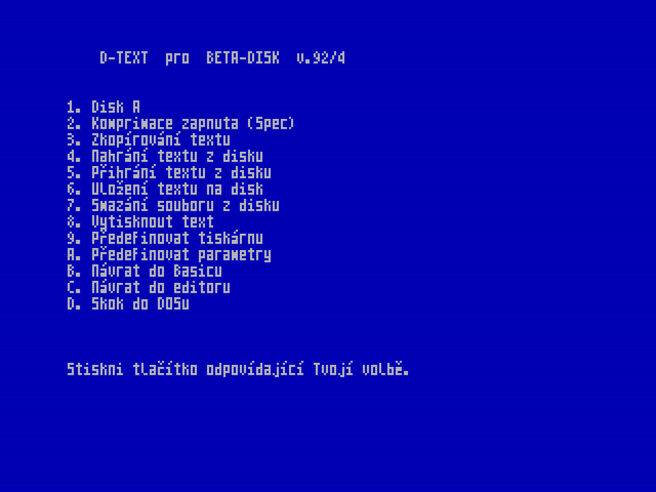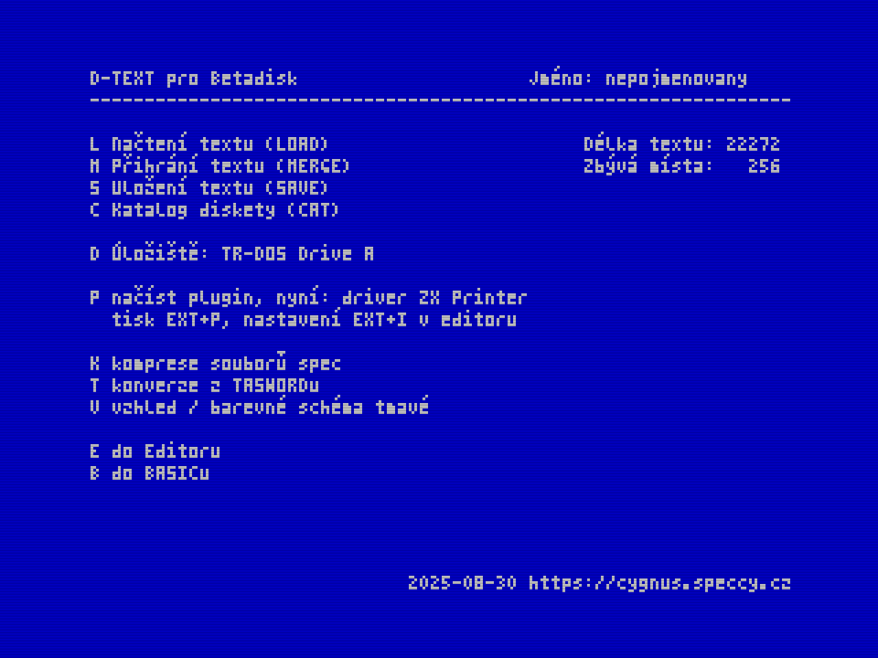 D-Text a vlastně už i původní Spectral Writer využíval pro práci se soubory příkazy v BASICu a s BASICovým programem byl provázaný mnohem víc, než se mi líbilo. Pro Betadisk upravený D-Text měl navíc vypnutou podporu pásky. Já chtěl obojí tak pohodlné, jak je jen možné, přičemž podpora pásky skrz standardní podprogramy Sinclair ROM je důležitá pro kompatibilitu s emulací pásky na ESXDOSu a BSDOSu. Neočekávám, že by někdo v dnešní době používal k ukládání skutečný magnetofon, ale možné to je. Primárně však počítám s podporou Betadisku, který je mým preferovaným disketovým systémem a i při používání na ESXDOSu nad obrazem diskety přináší dostatečné pohodlí.