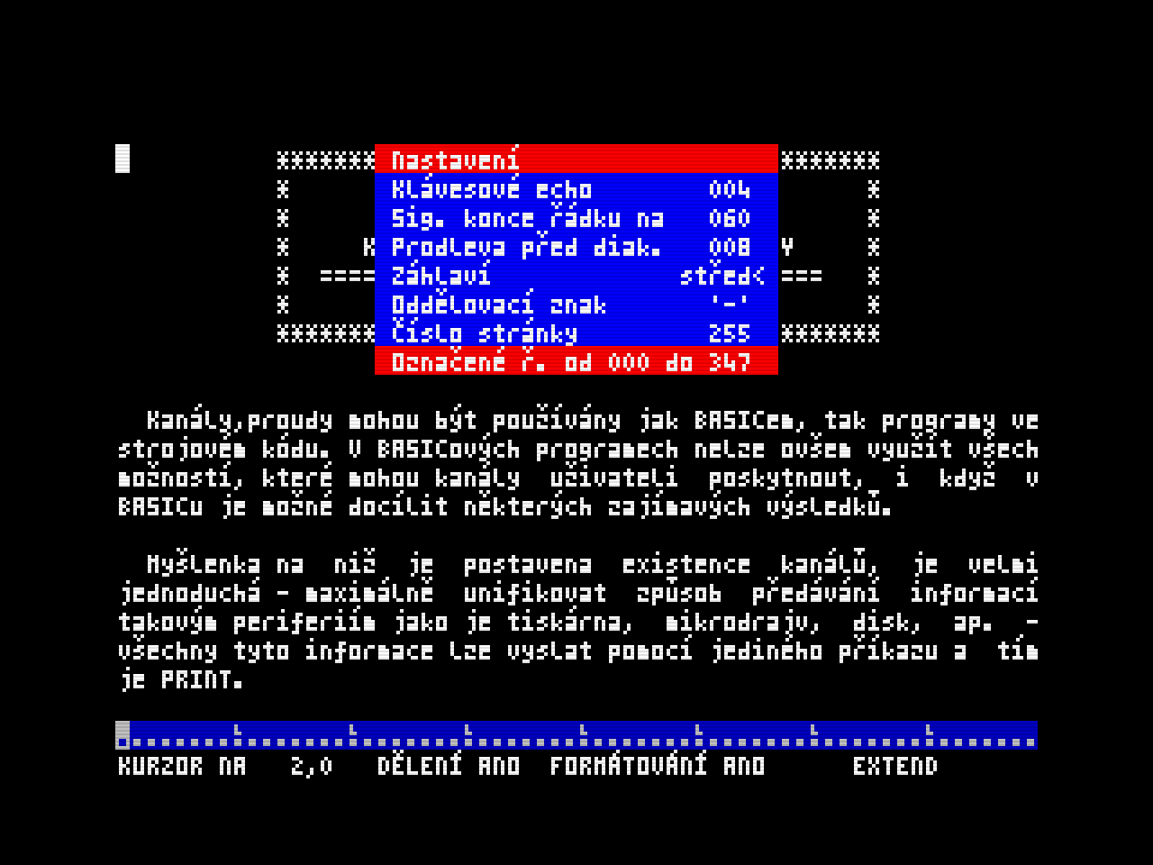 V textu se pohybuje kurzory ukrytými pod čísly 5, 6, 7, 8, klávesou DELETE, ENTER a několika dalšími klávesami v EXT režimu.