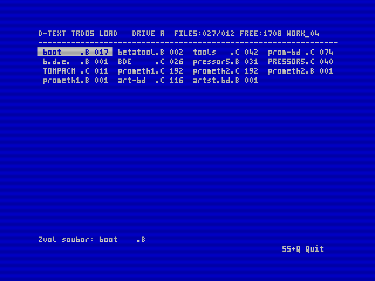 Proto jsem podprogramy pro práci s páskou přepsal společně s hlavním menu do strojáku. Tím se vše stalo menším a mnohem rychlejším. Zbylo mi díky tomu o kousek víc místa na buffer pro celý TRDOSový adresář, díky kterému jsem mohl napsat souborový dialog téměř tak pohodlný, jako na moderních PC. Při načítání stačí soubor jen vybrat bez opisování jména souboru, jako tomu bylo dosud, výběr je rychlý a potenciálně by mělo být možné, vejde-li se, přidat filtr (jen soubory začínající 32768 = pravděpodobně text, 63000 = pravděpodobně plugin), nebo řadit podle abecedy jako to dělá můj booter.