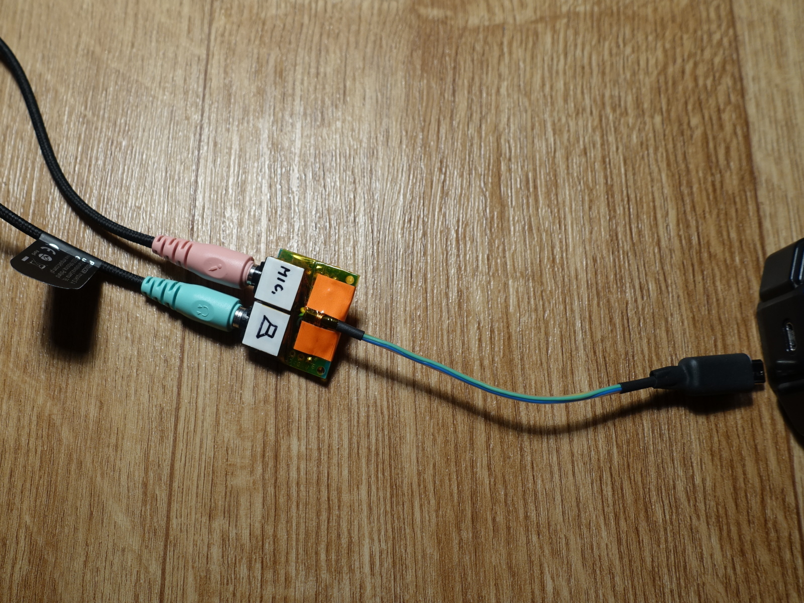 A nakonec zapojení konektoru, jak jsem to propípal. Doufám správně. Druhý obrázek ukazuje zapojení datového kabelu a zároveň ukazuje, proč není možné běžně dostupnými kabely nahradit sluchátkový kabel. V případě, že by bylo potřeba nahradit opotřebovaný micro USB konektor, je nutné sehnat 5 vývodový konektor samostatně.