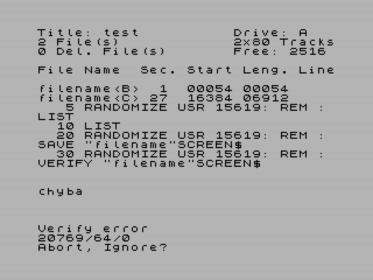 | VERIFY "jmeno"SCREEN$ | Porovná 6912 bytů v souboru s daty v paměti od adresy 16384. | ||